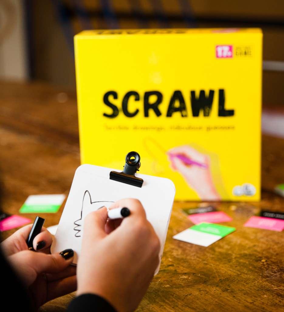 En Scrawl, todos comienzan dibujando una palabra secreta en su mini-libro de dibujo. Luego pasan su cuaderno al jugador de la izquierda: ese jugador debe interpretar lo que ve y escribir lo que cree que es, luego pasa al siguiente quien lo dibuja, y así sucesivamente 🖼️➡️🖊️➡️📄.