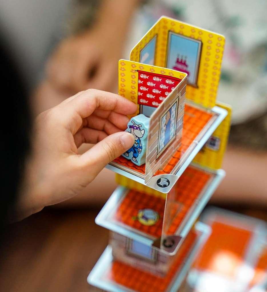 ¡La combinación perfecta entre los clásicos "Uno" y "Jenga"! Un juego de construcción vertical donde colocarás cartas de paredes y tejados para hacer subir a Rhino Hero… sin que se derrumbe la torre.