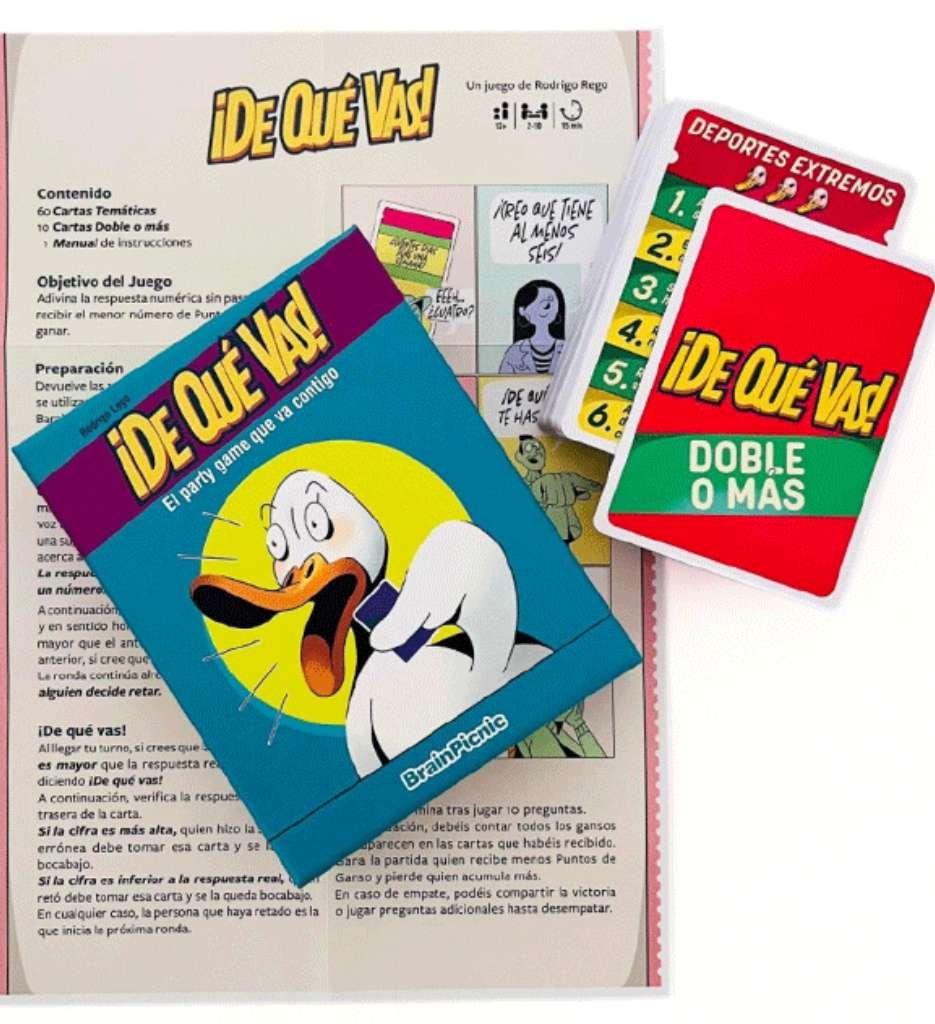Prepárate para un juego rápido, lleno de tensión divertida y momentos inesperados 😆🎲. En ¡De Qué Vas!, cada ronda presenta una pregunta de cultura general con respuesta numérica, como “¿Cuál es el coeficiente intelectual de Arnold Schwarzenegger: 70, 100 o 150?” 🤔📊 Luego de que un jugador propone un número, cada participante debe dar un número mayor que el anterior, o si crees que el número previo es demasiado alto, ¡puedes gritar “¡De qué vas!” 🗣️😜 y desafiarlo.