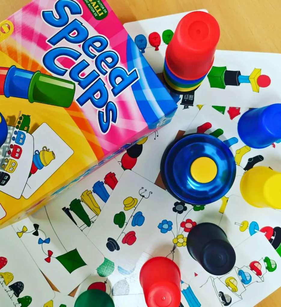 Speed Cups es un trepidante juego de reflejos en el que todos los jugadores compiten al mismo tiempo 🏁. Una carta muestra una combinación de colores y formas que deben replicar lo más rápido posible con cinco cubos. Pero atención: ¡a veces van en fila, a veces en columna! 😵‍💫