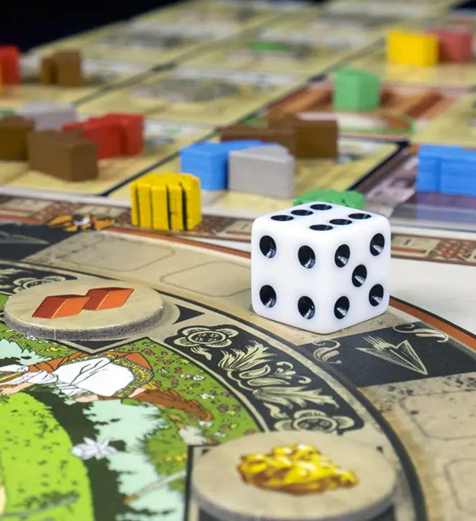 Uno de los elementos más originales es su sistema de rondel con dados 🎲🔄, donde eliges un dado y avanzas según su valor para conseguir distintos recursos. Este mecanismo le da al juego un ritmo muy dinámico y estratégico.