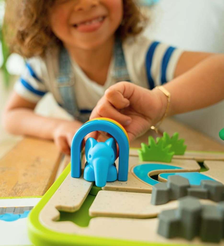En Safari Park Jr. de Smart Games, los pequeños jugadores deberán ayudar a un león, un elefante y dos jirafas a colocarse en la posición exacta para una “foto perfecta” 🦁🐘