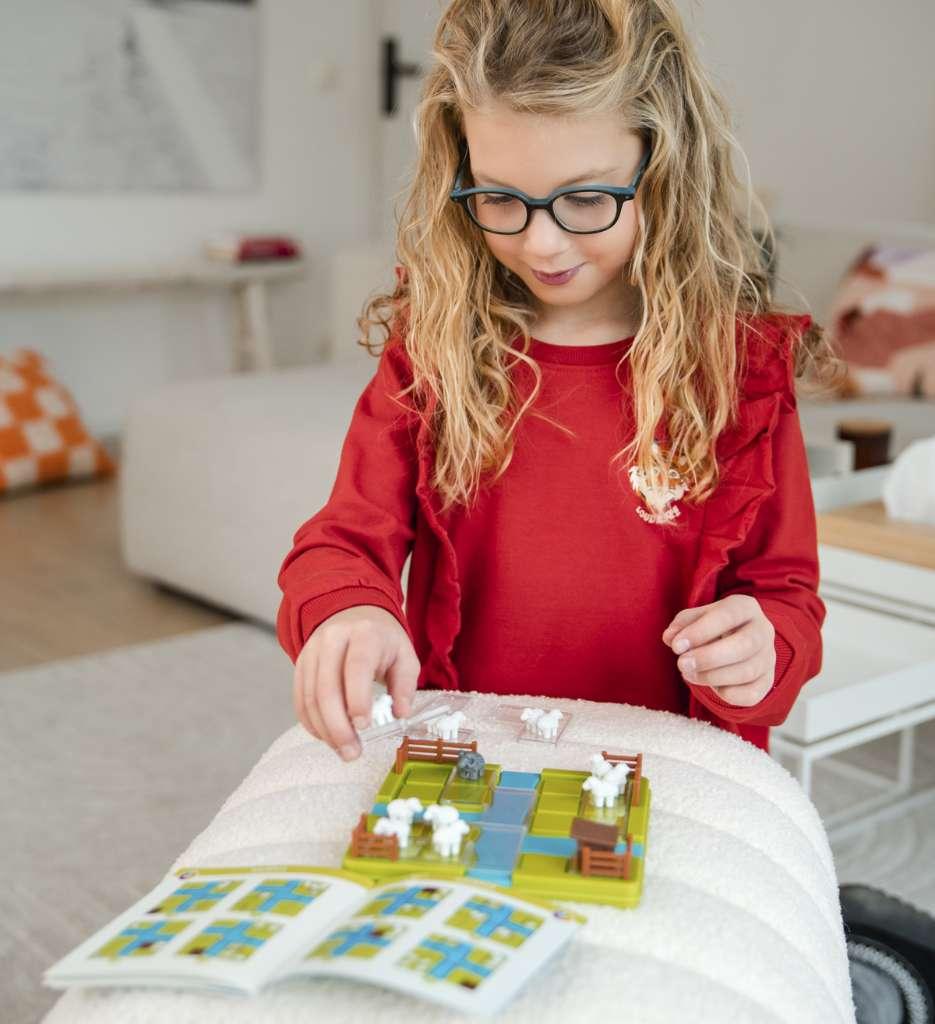 En Ovejas al Prado de Smart Games, tu misión es colocar correctamente las piezas de ovejas en el tablero para cumplir con los retos: